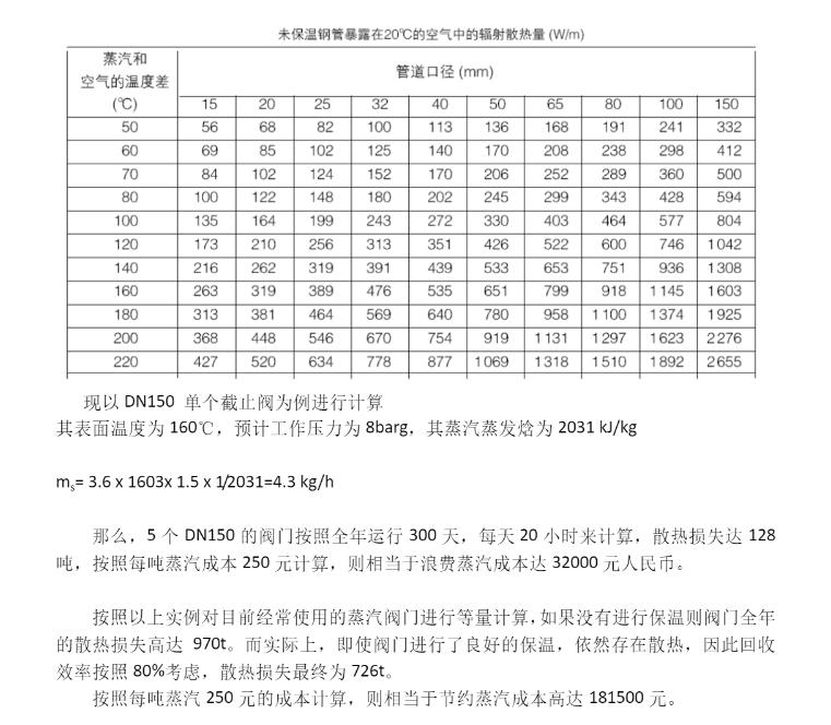 輪胎橡膠、玻璃制品等這些行業(yè)中,蒸汽的能耗降低是企業(yè)競(jìng)爭(zhēng)優(yōu)勢(shì)之一,有時(shí)蒸汽控制的好壞還會(huì)影響生產(chǎn)效率和產(chǎn)品的品質(zhì)。蒸汽閥門(mén)的散熱問(wèn)題是很?chē)?yán)重的,我們通過(guò)以下公式可以計(jì)算
